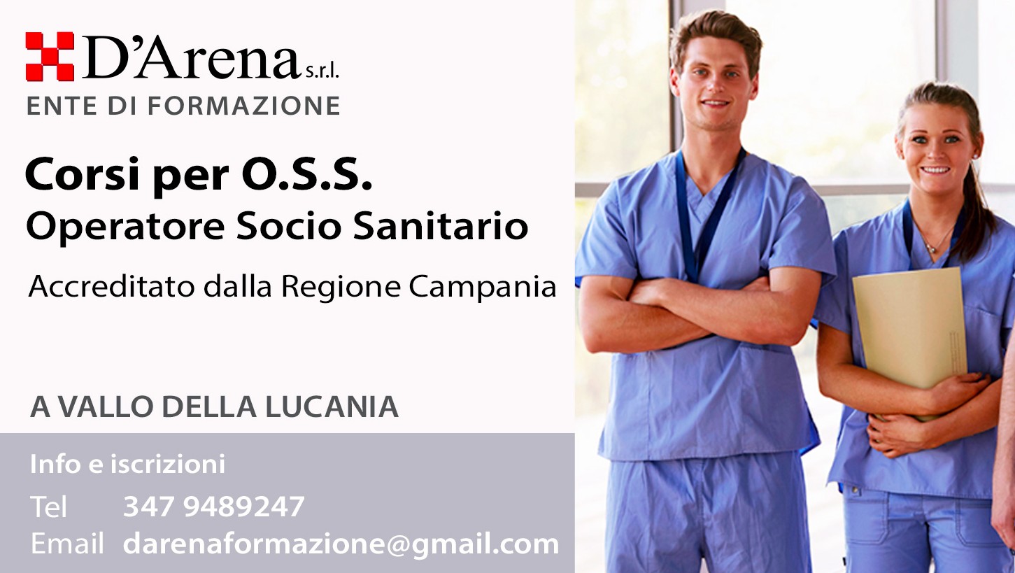 L'Ente di Formazione D'Arena Srl è una Agenzia di Formazione Accreditata dalla Regione Campania ai sensi del Decreto Dirigenziale n. 9 del 24.04.2024 – Codice Dominio 1630-1-1-S, pubblicato sul Burc n. 34 del 29 aprile 2024, numero registrazione: U150154SA000364001, opera in diversi settori della formazione professionale e vanta una lunga esperienza e una profonda conoscenza delle esigenze del settore sanitario.